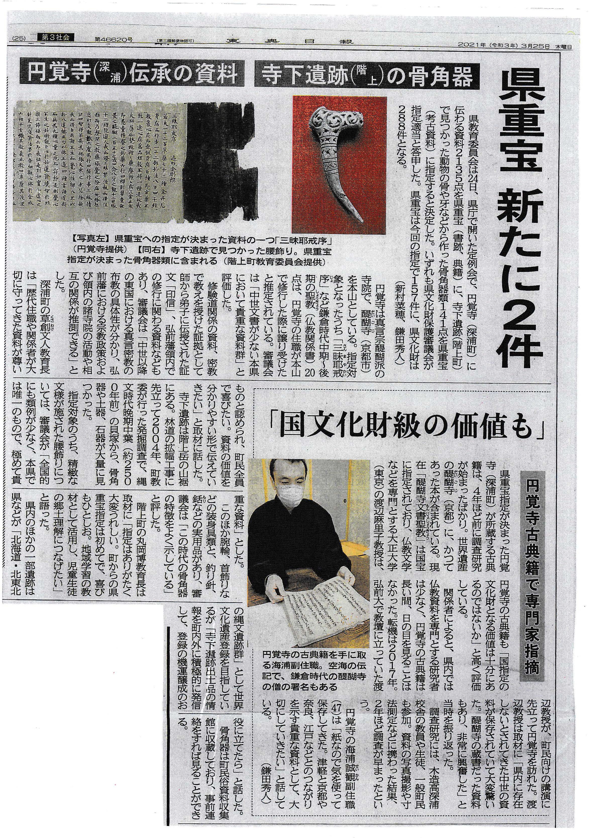 去る3月24日に、大正大学大学院文学研究科国文学専攻の渡辺麻里子先生が調査されていた、青森県深浦にある円覚寺の所蔵資料が、青森県の文化財に指定されました。この調査は大学生・大学院生、地元の高校生や市民が参加する、市民参加型調査(青森モデル)として行われたものです。下記に、渡辺先生のインタビューを含む2021年3月25日の「東奥日報」と「陸奥新報」を引用しますので、ぜひ御覧ください。