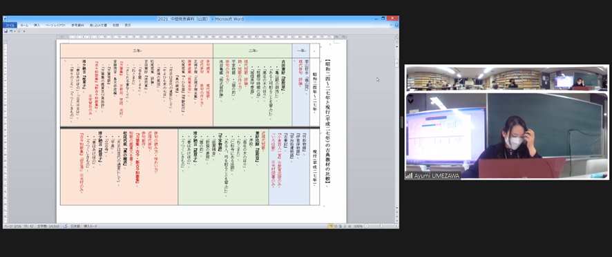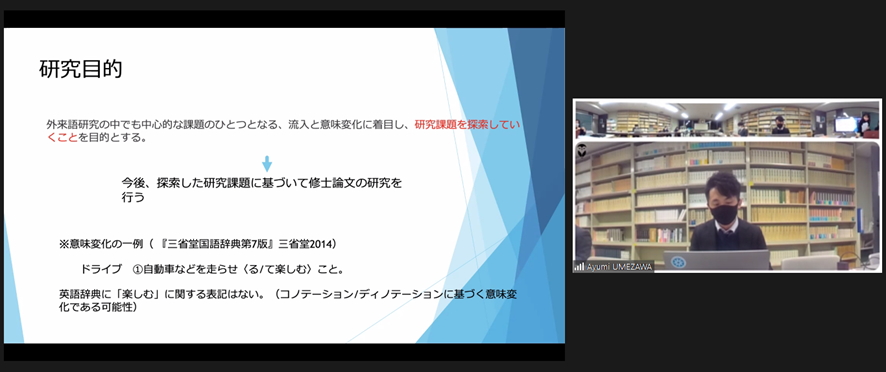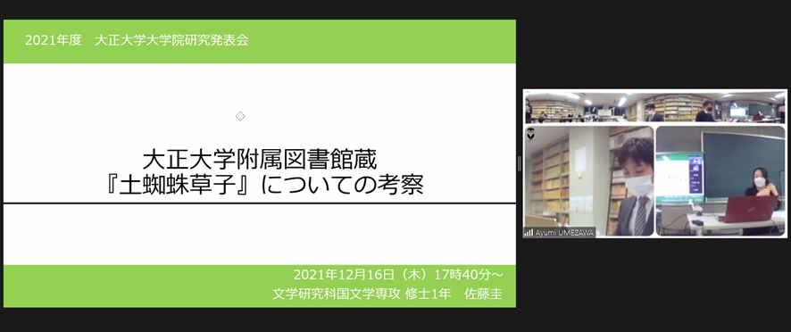 | 昨日12月16日(木)に、2021年度大学院研究発表会をオンラインにて開催しました。本年度は発表者と一部の教員は教室に集合して実施し、その様子をオンラインでも共有する形で実施しました。大学院修了生や学部生の参加もあって、活発な質疑応答が行われました。発表者の皆さんの今後の研究の進展に一層の期待をしたいと思います。 |