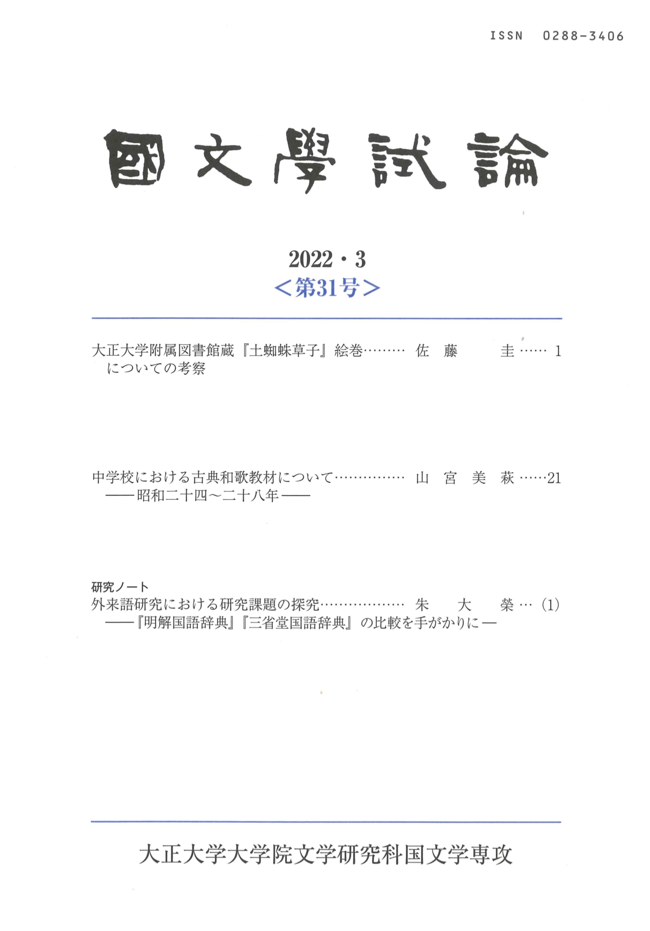 2022年3月に、『国文学試論』第31号(大正大学大学院文学研究科国文学専攻)を発行しました。 収録された論考は以下のとおりです(敬称略)。 【論文】 佐藤圭「大正大学附属図書館蔵『土蜘蛛草子』絵巻についての考察」 山宮美萩「中学校における古典和歌教材について――昭和二十四~二十八年――」 【研究ノート】 朱大榮「外来語研究における研究課題の探究――『明解国語辞典』『三省堂国語辞典』の比較を手がかりに――」 国文学専攻の大学院生による研究成果です。ご批正いただければ幸いです。なお、今号より大正大学機関リポジトリでも公開を予定しております。