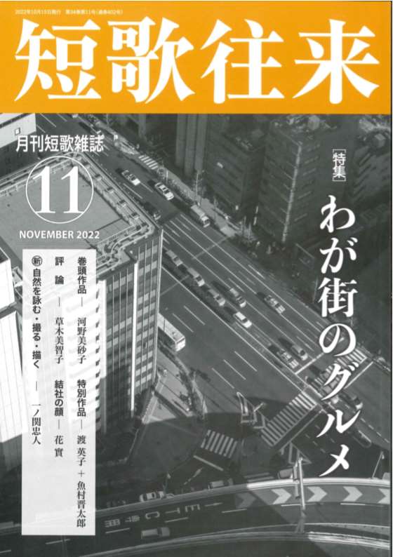 先月、大正大学大学院国文学専攻の梅澤亜由美先生から、修了生の草木美智子さんをご紹介したところですが、その草木さんの評論が短歌雑誌『短歌往来』2022年11月号に掲載されました。表紙にもお名前が印字されていて、引き続きご活躍の様子で喜ばしい限りです。