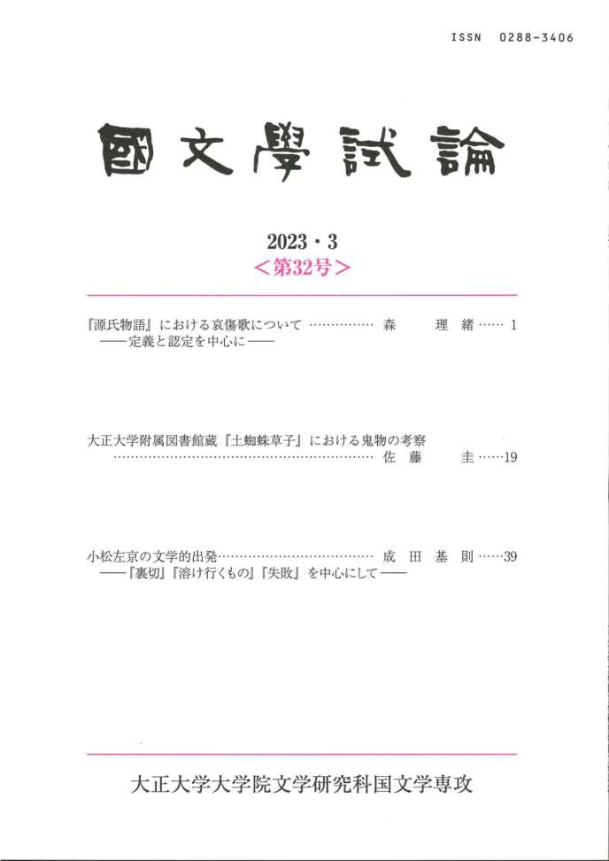 2023年3月に、『国文学試論』第32号(大正大学大学院文学研究科国文学専攻)を発行しました。 『国文学試論』は、大正大学大学院国文学専攻の大学院生の研究成果を世に問う実践の場として、国文学専攻が用意しているものです。大学院生の皆さんは、例年11月の大学院の研究発表会を経て、3月の刊行を目指して論文を準備しています。今年度も無事刊行出来たことを、専攻スタッフ一同喜んでいます。 収録された論考は以下のとおりです(敬称略)。 【論文】 森理緒「『源氏物語』における哀傷歌について―定義と認定を中心に―」 佐藤圭「大正大学附属図書館蔵『土蜘蛛草子』における鬼物の考察」 成田基則「小松左京の文学的出発―『裏切』『溶け行くもの』『失敗』を中心にして―」 なお、引き続き大正大学機関リポジトリでも公開を予定しております。どうぞご批正いただければ幸いです。