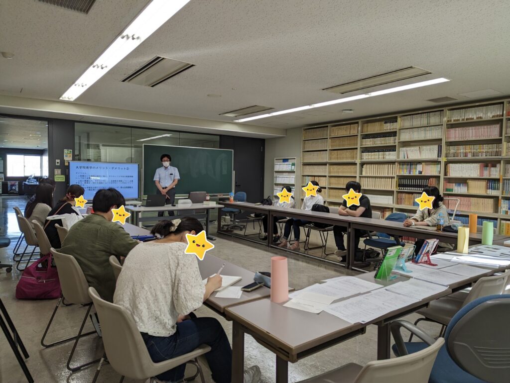 7月7日(金)に、在学生向けの大学院見学会、説明会を実施しました。今回は久しぶりの対面実施で、現役大学院生4名にも参加してもらって、大学院生の生活や授業の様子などの見学を含めた説明会を開催しました。 |
