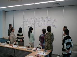 第5回のゼミテーマは、「KJ法で整理する「いのちの教育」案」でした。最初に、KJ法(カードに一つの案を書いて、それを全員で見ながら、整理していく方法)に則って、前回のゼミに出された宿題である「地域の人が関われることを前提とした学校でのいのちの教育案」3案をそれぞれ紙に書いて壁に貼っていきました。そして、それを受講者みんなで眺めて、似たような案や目的が同じような案を整理し、2つの分類を作っていきました。分類は、「体験型ワークショップ」と「地域の人を呼ぶ」をするというものでした。