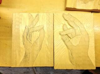 今回の題材は、指や手のデザイン、凹凸の彫り方は、立体作品の制作に通じる練習になるということから先生が選ばれました。手が上手く作れることは、彫刻の一つのステップアップになるとのことで、必須の練習だそうです。参加者一同、指や手の凹凸を出すことの難しさに四苦八苦しながらも、お地蔵さんを造った経験から少しずつ彫り進めていっています。