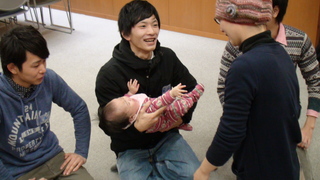 実際にだっこをしてもらう児童役として、齋藤が現在担当している教育人間学専門ゼミ(3,4年生)の学生10人に来てもらい、模擬授業の教員役も教職を志望しているゼミの学生が担当しました。赤ちゃんとお母さんは、2組来てもらいました。