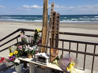 海岸には供養のための塔婆と花が供えらえていた