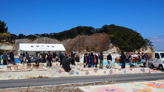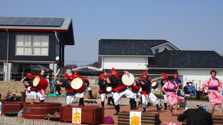 復興エイサーは、道の駅よつくら港で行われました。道の駅よつくら港は、津波によって建物が甚大な被害を受け閉鎖されていましたが、昨年8月にリニューアルオープンしたとのことでした。10日は風も強く、エイサーの開催自体も危ぶまれましたが、沖縄から来たエイサーの諸団体は「津波よりたいしたことはない」と言って力強く舞っていました。会場には多くの方がいらっしゃり、いわきの伝統芸能である「じゃんがら念仏踊り」と深いゆかりのあるエイサーに心励まされているようでした。