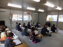 浜○かふぇの前の写経会の様子(2013年1月 上荒川応急仮設住宅団地 第2集会所)
