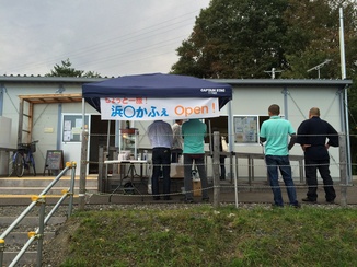 あいにく、活動中に大雨になってしまって洗濯物を取り込むためなどで帰宅する人も見られましたが、集まった方々は楽しいひとときを送っていたように感じます。その一方で、「私たちはこれからどうなるのか」や「現在の状態はどうなっているんだろう」といった話も聞こえ、浜○かふぇの場が単なる憩いの場ではなく、住民の方々の情報交換や相談の場になっている、との感想を持ちました。