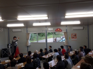 浜浄青会長の柳内悦大さんによると、浜○かふぇが活動する仮設住宅は毎週異なっていて、仮設住宅によって集まる住民の数や年齢層などは様々だそうです。年齢層は、高齢者が中心ですが、子ども達が学校から帰宅するとすぐに集会場に集まり、僧侶や同行したボランティアと遊んでいるとのことでした。今回訪れた仮設住宅は比較的多く集まるところで、40名ほどの住民が集会場に来てくれました。帰宅後訪れた子どもたちは、TASUKUさんから風船の作り方などを教えてもらっていたり、青年僧侶と追いかけっこをしたりしていました。