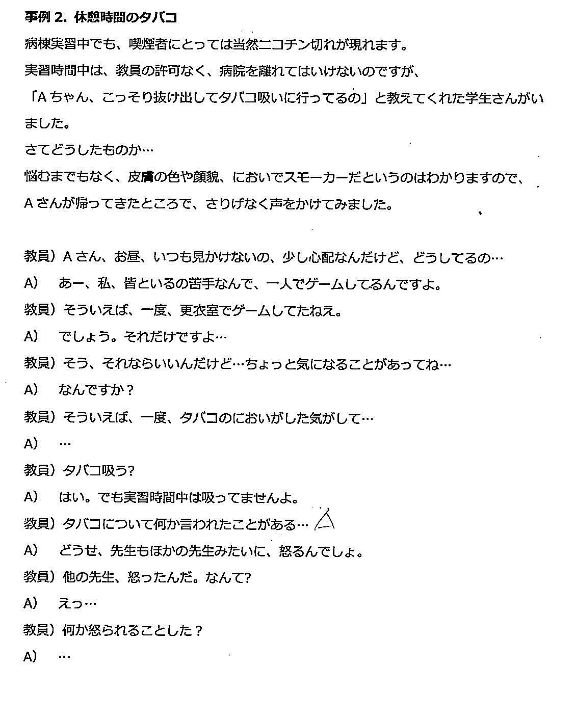 レジュメの一部を抜粋(タバコを吸う実習生Aとある教員とのやりとり)