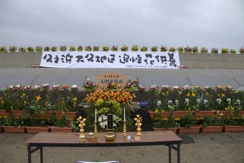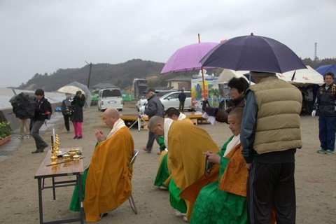 8日は、それぞれ3つの班に分かれて、各行事を見学させていただきました。ここでは、魚尾が見学させて頂いた、久之浜大久地区追悼花供養について書かせて頂きます。雨風強い中、9時半より久之浜の海岸にほど近い場所にて追悼花供養は開始されました。最初に以前お話をお伺いした、真言宗智山派福島第一教区智山青年会による法要が執り行われ、海に向けて造られた祭壇に地域の方々が花を手向けました。