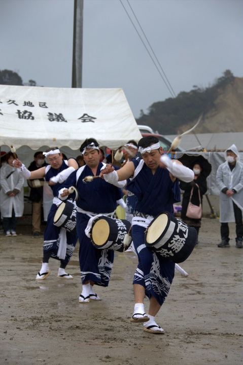 その後、地元や仙台、市原の団体によるエイサーや踊りの演舞や、歌の披露が行われました。震災発生の午後2時46分には、サイレンとともに黙祷が捧げられました。その後、地元久之浜のじゃんがら念仏踊りの団体による供養が行われました。雨風が強い中、じゃんがらの踊り手達は厳かに供養を行い、多くの人がその踊りと共に祈りを捧げていました。最後は、参加者全員による合唱で花供養は終了となりました。