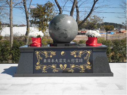 慰霊碑は、2014年08月30日、日本タオイズム協会によって建立されました。3.11当時、いわき市で被災した同協会は、同じ道教として交流のあった台湾の台湾首廟天壇と大観音亭興斎宮から、また、台湾の3つ小学校から義捐金が送られました。こうした支援に対する感謝と、震災の記憶を風化させないために、モニュメントが作られたそうです。地球を模しているモニュメントは、正面から見るとちょうど日本と台湾が見えるようになっていて、義援金に対する感謝が伝わります。また、台座には陰陽の印と2匹の龍が描かれており、中国と日本の文化のつながりを大事にする、日本道観の拘りが私には感じられました。