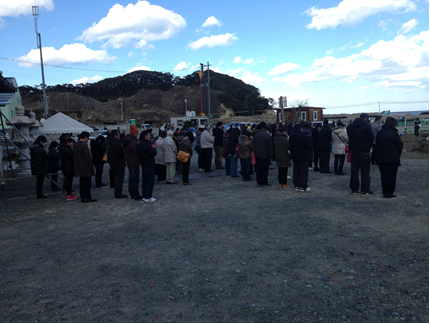 本調査では、震災から4年経ったいわき市において、宗教者がどのような活動を行っているのかを、慰霊祭や法要に参加することで理解しようとしました。私は、真言宗智山派青年会智山派青年会による海岸塔婆回向に参加しました。海岸塔婆回向は、いわき市内の海岸沿い9カ所に安置された、震災物故者のための塔婆を行脚する行事です。当日はあいにくの冷たい風が吹き付ける中、2つの班に分かれて行われました。1班は久之浜、四倉、江名、永崎、豊間に、2班は小之浜、小浜、岩間、須賀を車で回り、回向をしました。塔婆に向かって読経し、回向をする青年会の方々からは、粛々とした雰囲気とともに、死者に向き合う真剣さが伝わってきました。