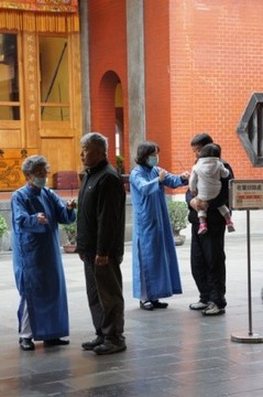 行天宮は1943年に創建した行天堂を起源とする関帝廟です。道教が基になっているものの、龍山寺と同様に仏教や儒教との習合がみられます。香炉は3カ所あり、中央には関聖帝君を含む「五恩主」が祀られています。さて、ここで目立っていたのが前述の「お祓い」です。これは「収驚(ショウジン)」とよばれ、「ショック等により抜けてしまった魂を体に戻す」儀式なのだそうです。行天宮では、青い衣のボランティアが参拝者に線香の煙をかけながら体を叩く様子をみることができました。