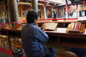 龍山寺の本尊は台湾で最も高い人気を誇る観世音菩薩ですが、境内では道教や儒教などさまざまな宗教の神格等も数多く祀られています。ここでも、台湾の廟で一般的に見られるような参拝形式が取り入れられており、参拝者は長い線香を購入後、境内に配置された7つの香炉の前で順に参拝します。この台湾での参拝方法は拝拝(パイパイ)と呼ばれており、頭上に線香を重ね、振るようにして礼をするのが特徴的です。願いごとをするまえには、心のなかで名前、生年月日、住所を神に告げます。そうして、香炉ごとに自己紹介と願掛けをし、手持ちの線香を1本ずつ香炉にさして行くのです。参拝客たちは真剣な面持ちで祈りを捧げていました。