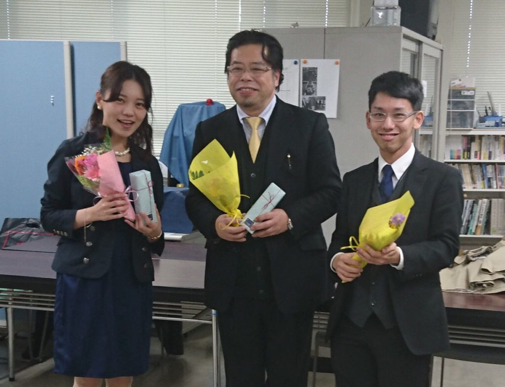 夜の謝恩会の前の時間にささやかながら開催した研究室の壮行会には、このうち秋山さん・水島さん・大場さんが出席され在校生より記念品と花束の贈呈が行われました。