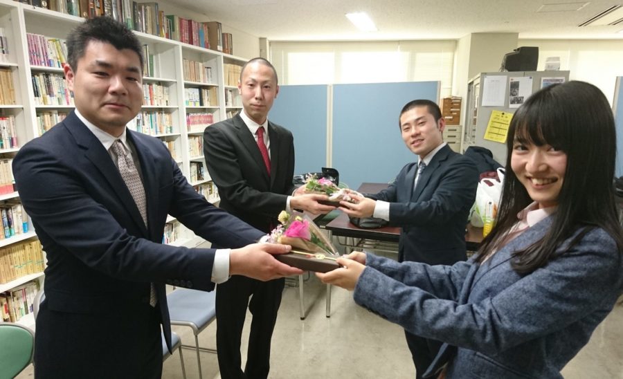 授与式の後、研究室にてささやかながら謝恩会を開催し、在学生より記念品と花束が贈呈されました。また、修了生からは感謝のことばと今後の抱負が述べられ、先生方からも激励のことばが贈られました。