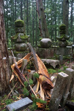 奥之院は、弘法大師の御廟がある聖域です。御廟までの約2キロにわたる道のりには、様々な企業が建立した「企業墓」や、織田信長の供養塔や豊臣家の墓所といった諸大名の墓石など、20万基を越える墓、慰霊碑、供養塔が立ち並んでいます。中には、楽書塚やお化粧地蔵など一風変わったものも見られました。ですが、ここでも台風の影響は例外ではなく、倒木による墓石の倒壊などの被害がみられました。