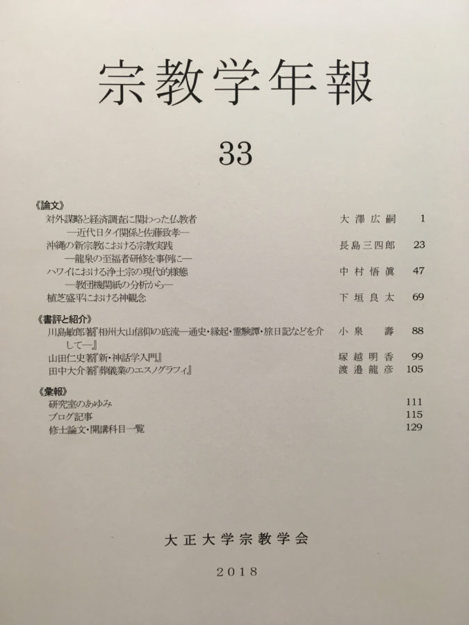 大正大学宗教学会で発行している『宗教学年報』第33輯がこのたび刊行にいたりました。執筆者・関係者のみなさまに、心より感謝申し上げます。