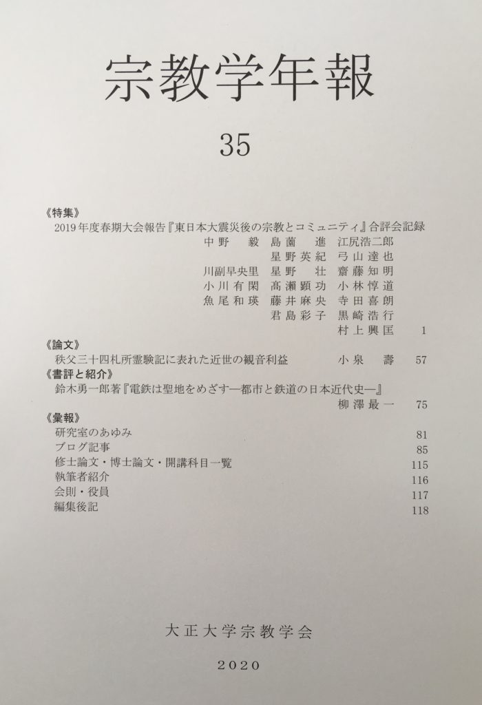 大正大学宗教学会で発行している『宗教学年報』第35輯がこのたび刊行にいたりました。コロナの影響により、2020年度の大会が延期、本誌の刊行もずれこんでいましたが、おかげさまで何とか刊行にこぎつけることができました。執筆者・関係者のみなさまに、心より感謝申し上げます。