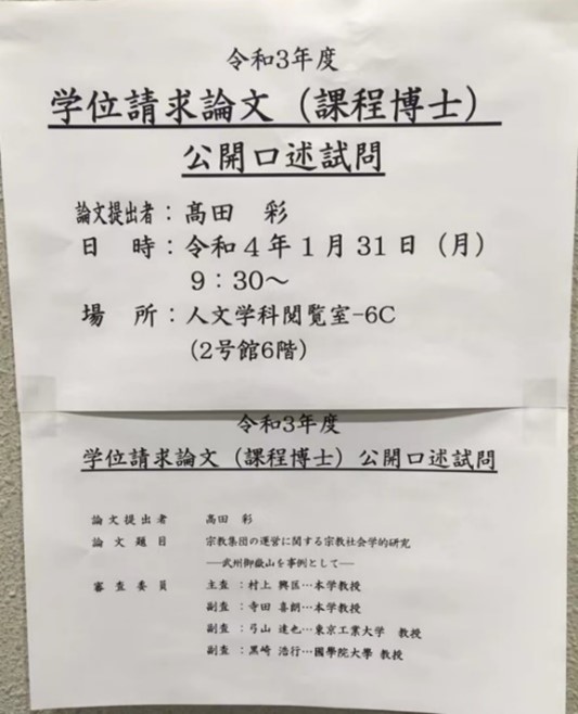 2022年1月31日(月)、宗教学研究室(2号館6階)にて、令和3年度学位請求論文(課程博士)公開口述試問が行われ、博士後期課程の高田彩さん・大場あやさんが審査を受けました。