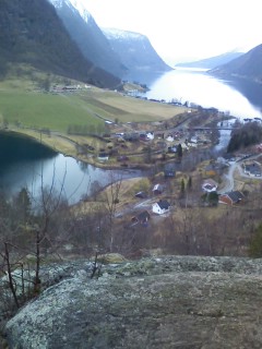 写真はショルデンの中心部です。写真の右上がノルウェー最大のフィヨルド、ソグネフィヨルドの最奥部分です。左がウィトゲンシュタインが建てた小屋のあった湖です。
