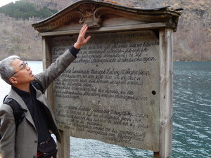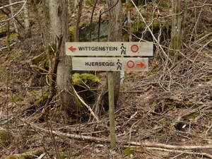 途中にある「案内板」です。ノルウェー語とドイツ語と英語で書かれています。内容は簡単で、ウィトゲンシュタインの名前や代表作などについて触れられています。 三角屋根の下側に、ウィトゲンシュタインの小屋が彫りこまれています。装飾ですが、今から訪れる小屋跡を示唆しています。