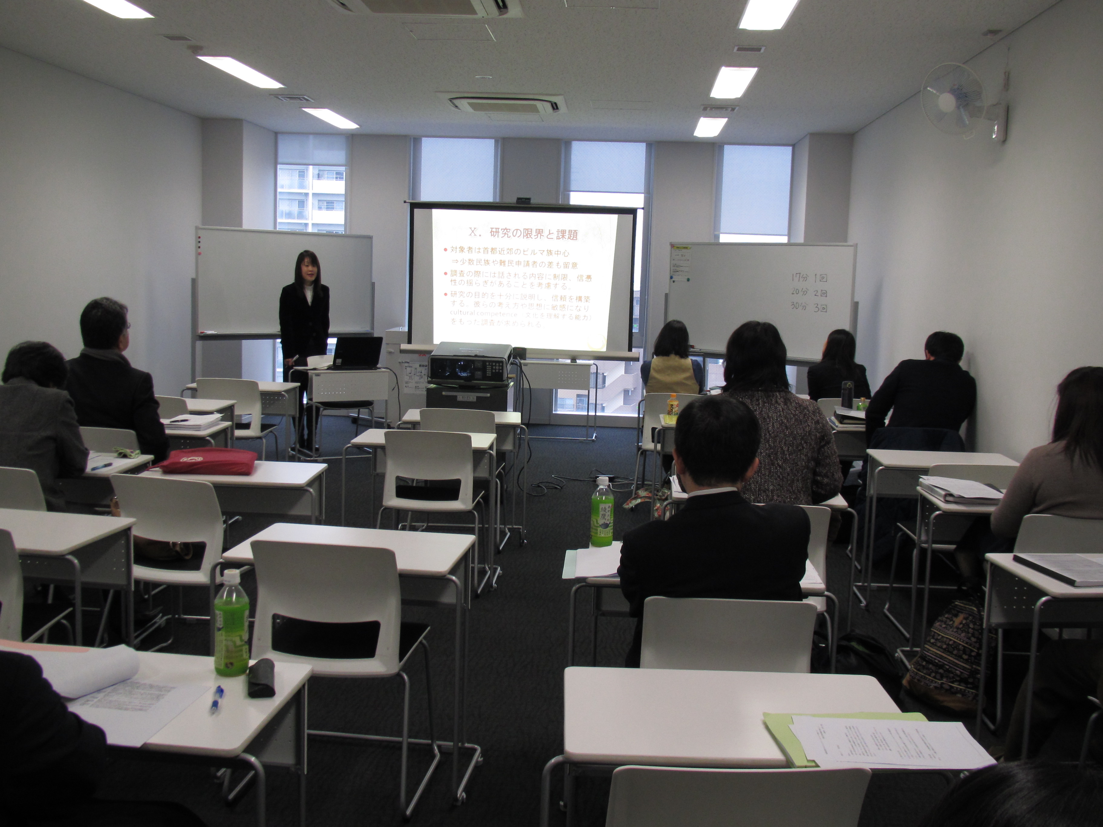 当日、修士課程の院生は発表20分、質疑応答10分という時間が与えられ、2年間あるいは3年間の成果についてパワーポイントを活用しながら発表しました。