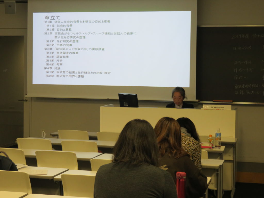 ご自身のお母様の介護体験や 学部生時代の学習支援ボランティア活動が、それぞれに契機となり研究の問いが立てられ、先行研究を踏まえて調査が設計・実施され、そしてそこから導き出された結論と今後の課題が簡潔にまとめられていました。それぞれに試行錯誤しながらも、問いに誠実に向き合いまとめてきた様子が伺える発表でした。