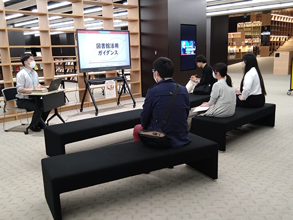 留学生も含めた、入学したばかりの1年生にもわかりやすいように、OPACを中心とした多様なデータベースによる検索方法等を丁寧にご説明いただき、その後、実際に書籍を探す実習も行いました。