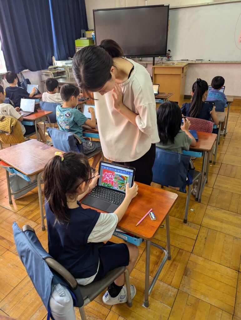 2年2組の児童は27人いますが、児童全員に目配りしながらも、机間指導を行い、児童一人一人の個別最適な学びも目指しています。