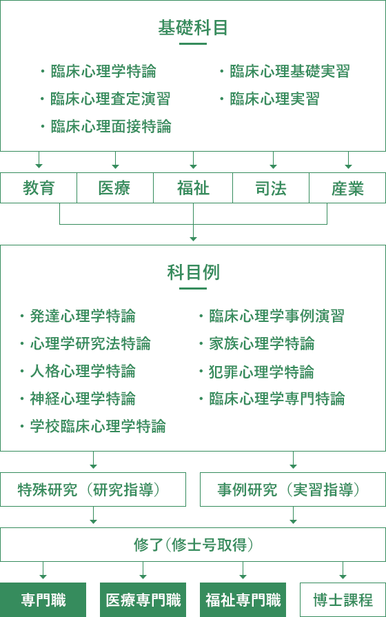 臨床心理学特論4単位、臨床心理査定演習4単位、臨床心理面接特論4単位の計12単位を必修、臨床心理基礎実習を2科目2単位、臨床心理実習を2科目2単位、それぞれ選択必修とする。