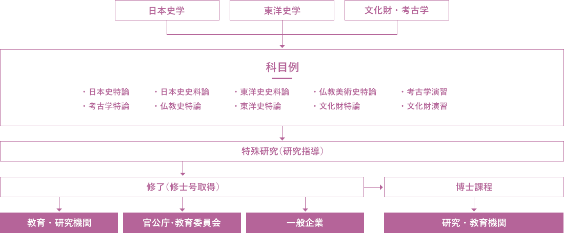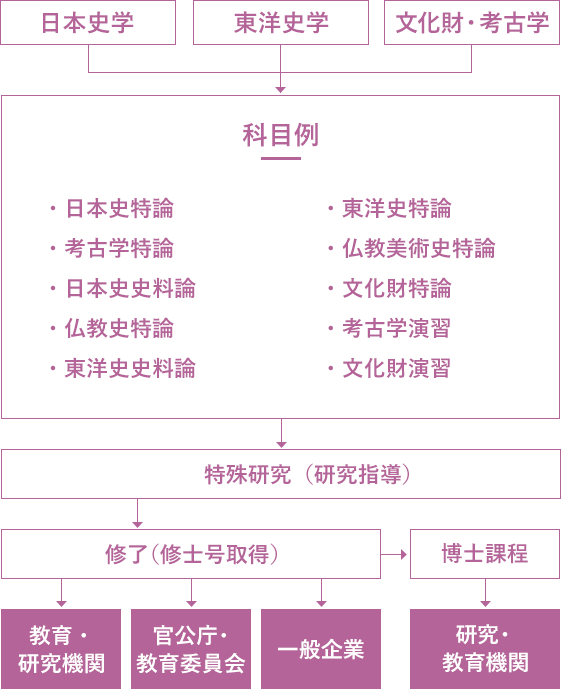 - 日本史、東洋史、文化財・考古学に関する歴史研究の学界動向を踏まえた専門知識を身につけ、体系的に理解し、従来の研究成果を継承・発展させた上で、自己の研究を総合的にまとめて独自の成果を発表する能力を養う。
