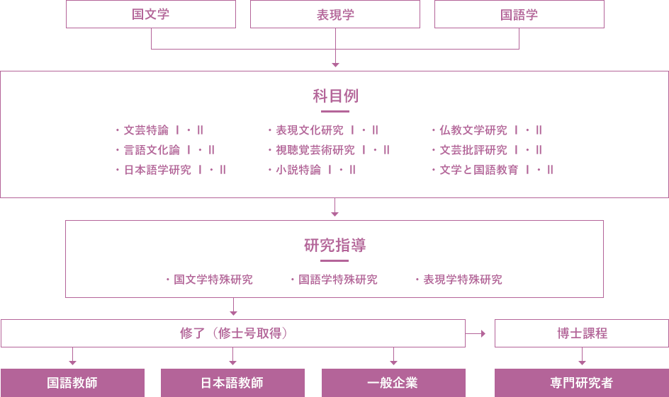 - 日本語学・日本文学・国語教育の各分野おける基本的知識を身につけるための基礎科目、専門的知識と基本的技能を習得するための特論科目、そして、実証的・論理的な論文の作成のための特殊研究科目を設けています。