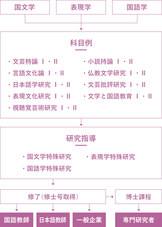 - 日本語学・日本文学の各分野おける専門的知識を身につけるための専門科目、調査研究および発表の発展的な技能を習得するための特論科目、関連の学術領域の成果の中に独創的成果として位置づけられる、実証的・論理的な論文の作成のための特殊研究科目を設けています。