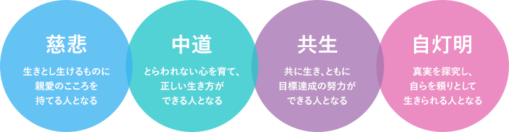 この精神に基づき、調和的な全人格陶冶を目指す全人教育を通して、人間を総合的に理解し広く社会に貢献できる人材を養成することが本学の基本理念であり、平成21年3月には建学の理念に基づく教育ビジョン「4つの人となる」(慈悲・中道・自灯明・共生)を以下の通り定め、人類の福祉に貢献する人材の養成に取り組んできました。