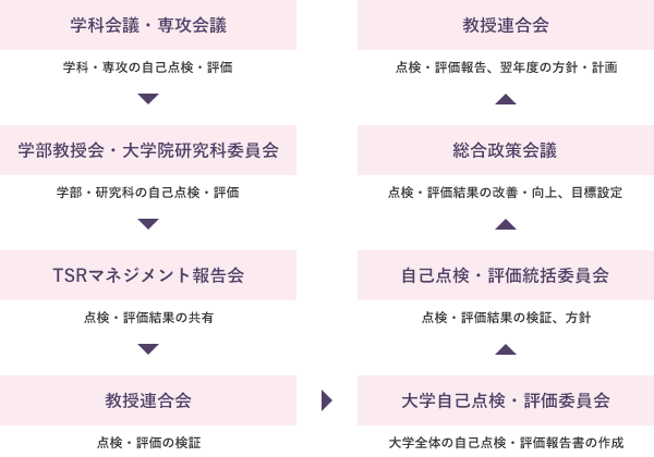 内部質保証については、「大正大学内部質保証方針」に基づき、学部学科、研究科専攻の点検・評価、学長・副学長による評価・検証、「大学自己点検・評価委員会」による全学的な点検・評価・検証を行っています。そして、全学内部質保証推進組織である「総合政策会議」が点検・評価結果基づき、改善・支援等を実施しています。また、内部質保証の実質化ために、教学IR推進部会によるデータの収集・可視化・提供、大正大学ファカルティ・ディベロップメント委員会による教育活動の改善及び質の向上に関する施策も実施しています。