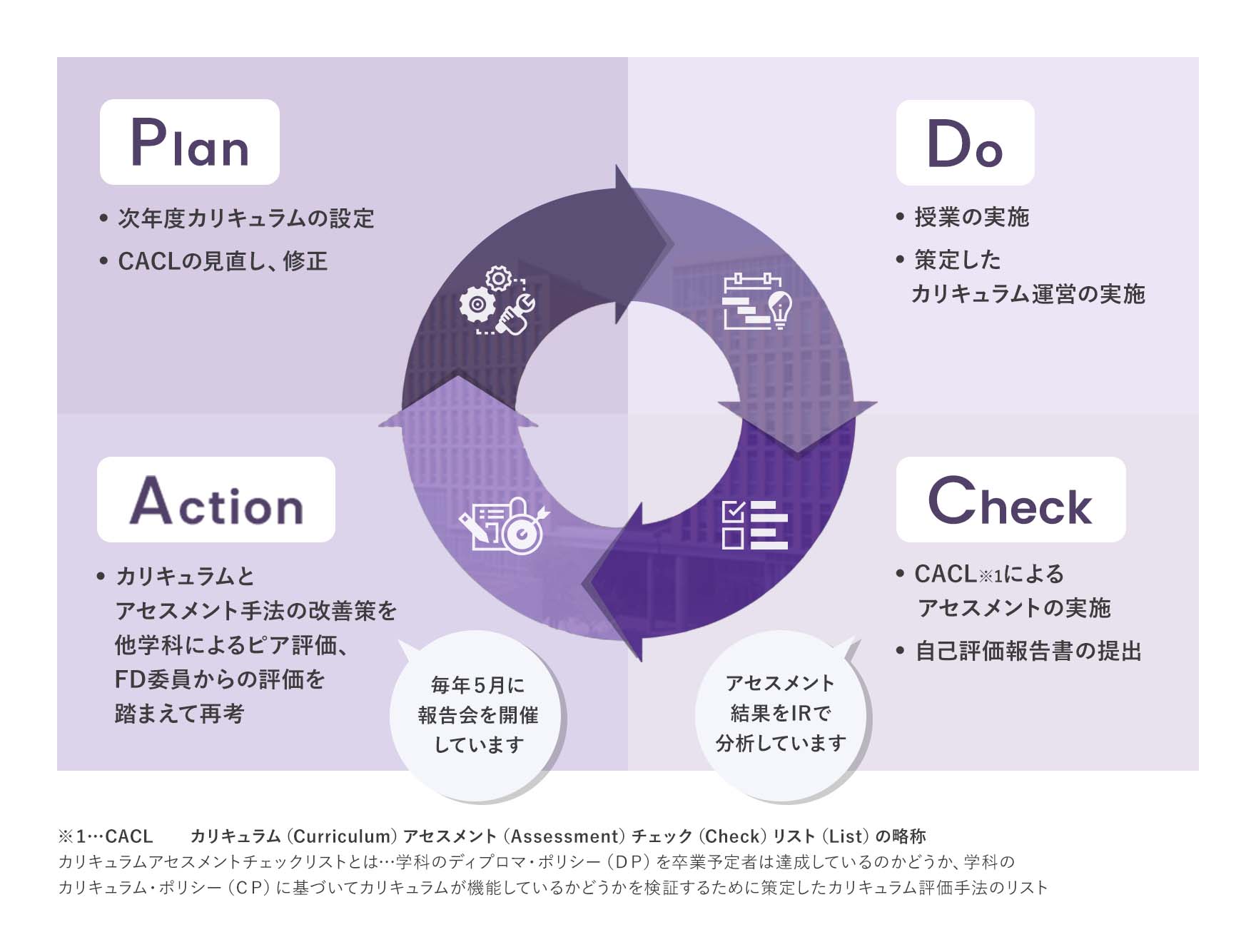2016年度よりアセスメント体制の構築を図り、学修成果・教育成果を把握・可視化し、授業やカリキュラムを改善する目的でカリキュラムアセスメントのPDCAサイクルを運用しています。毎年5月に「CACLを活用した自己評価報告会」を実施しています。