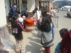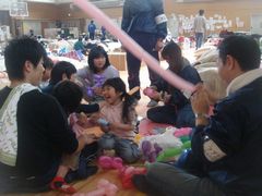 晴天の日には綿菓子を被災者の方にお配りしました。子どもだけでなく、高齢の方にとっても綿菓子は好評でした。懐かしさを感じるとの声が聞こえました。DVD映画の上映に当たっては、対象を大人と子どもに分けていました。午後の上映は子ども向けのDVDを選びました。その上映直前の昼休みには、物資仕分け班の学生も加わって、子どもたちと一緒に運動場でサッカー等を楽しみました。