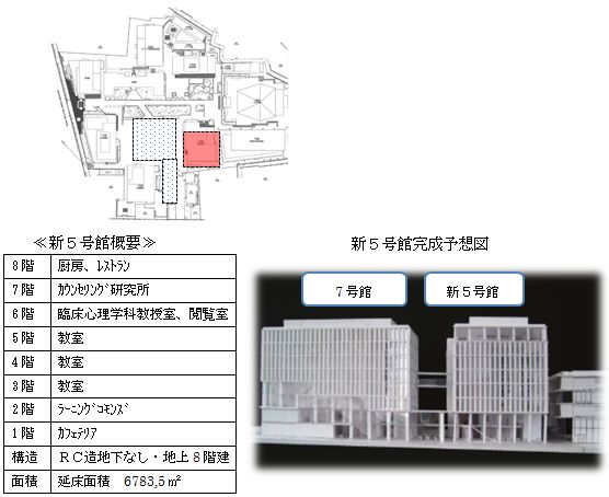 標記の件につきまして、教育に係る施設設備及び学生サービスの拡充に伴いまして、下記の通り5号館を解体し新棟(新5号館)を建築致します。工事期間において騒音、大型車両の通行等で皆様にご不便をおかけすることとなりますが何卒ご理解ご協力のほどお願い申し上げます。