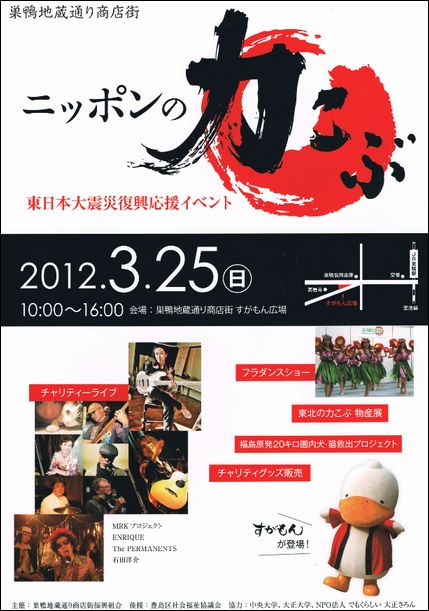 3月25日、巣鴨地蔵通り商店街主催の東日本大震災復興応援イベント“ニッポンの力こぶ”が開催されます(豊島区社会福祉協議会後援、中央大学、大正大学、NPO法人でもくらしぃ大正さろん協力)。開催時間は10時~16時で、会場はJR巣鴨駅徒歩数分の商店街入口すがもん広場(真性寺前)です。