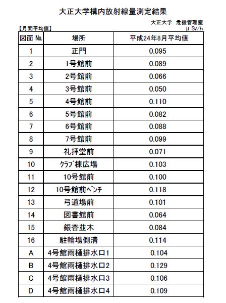 各建物(教室棟等)の入口、通行量の多い地点を地上1メートルから線量測定した結果、※環境省が示した除染実施計画基準「放射線量が1時間当たり0.23マイクロシーベルト」未満の数値が検出され、人体に影響が無い数値と判断いたしました。測定場所と数値は下記の表にてご確認いただけます。