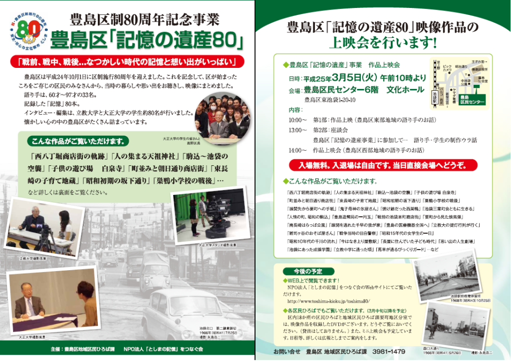 豊島区「記憶の遺産80」作品上映会に本学表現学部の学生が参加します