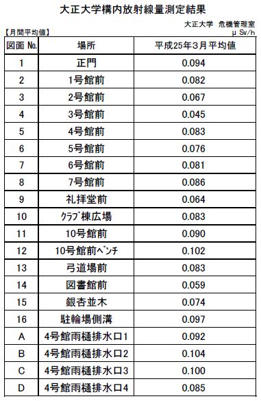 各建物(教室棟等)の入口、通行量の多い地点を地上1メートルから線量測定した結果、※環境省が示した除染実施計画基準「放射線量が1時間当たり0.23マイクロシーベルト」未満の数値が検出され、人体に影響が無い数値と判断いたしました。測定場所と数値は下記の表にてご確認いただけます。