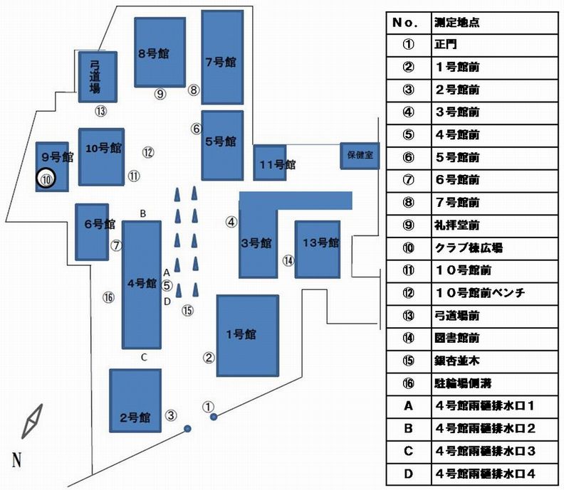 各建物(教室棟等)の入口、通行量の多い地点を地上1メートルから線量測定した結果、※環境省が示した除染実施計画基準「放射線量が1時間当たり0.23マイクロシーベルト」未満の数値が検出され、人体に影響が無い数値と判断いたしました。測定場所と数値は下記の表にてご確認いただけます。