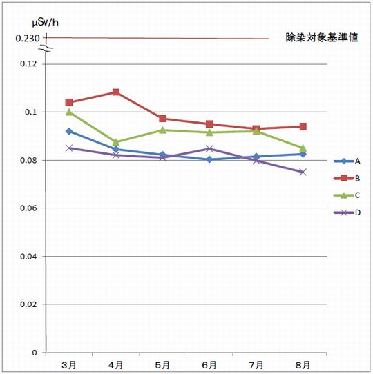 各建物(教室棟等)の入口、通行量の多い地点を地上1メートルから線量測定した結果、※環境省が示した除染実施計画基準「放射線量が1時間当たり0.23マイクロシーベルト」未満の数値が検出され、人体に影響が無い数値と判断いたしました。測定場所と数値は下記の表にてご確認いただけます。