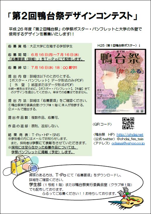 平成26年11月2日、3日に開催される、第2回鴨台祭の学祭ポスター・パンフレットと大学の外壁で使用するデザインを募集いたします。