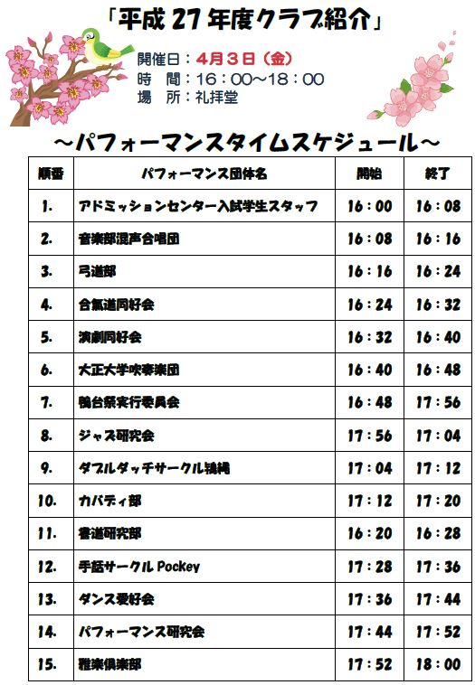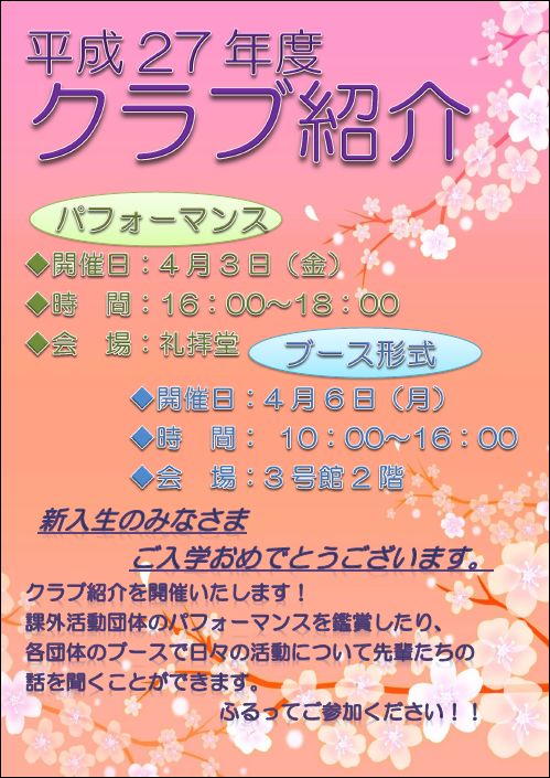 課外活動団体の活動について先輩たちの話を聞くことのできる平成27年度クラブ紹介を以下の日程で開催いたします。